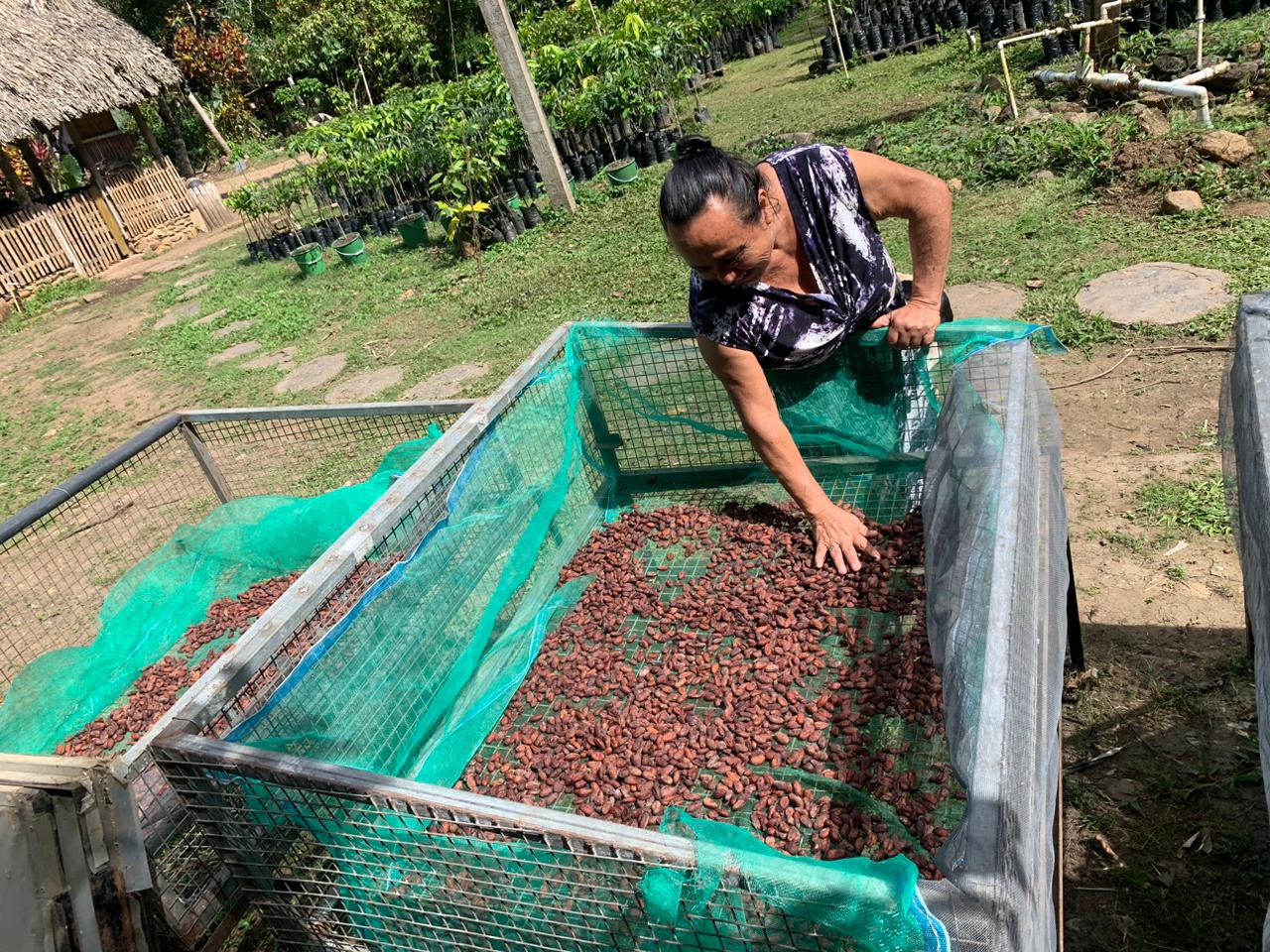 Frutas del Mundo, owned by Dwight Carter of Park Rapids, has devoted a good share to nursery production of many tropical fruit tree species. One of the more important of these, both for the volume and for the social impact in the communities that plant the trees, is cacao. Since it is a plant nursery, they start with seeds selected from the heartiest of cacao plants, and seed them in sand germination boxes, and then transplant them into bags to be grown out to become rootstock for grafting. To procure the budwood that is needed for grafting, a clonal garden is maintained of the best varieties of cacao. It is from this garden that a good share of the cacao pods are used to make the chocolate. Once the pods are ripe, they are gathered and cracked open to take out the ‘baba’, the juicy fruit and seeds. The baba is placed in wooden vats that are lined with banana leaves and a 5-7 day fermentation process takes place. This requires great care and experience to be done properly. When the cacao has been properly fermented it can be carefully dried in the sun. This requires special wooden drying racks and coverings. At 5-7% moisture we finally have what is traditionally referred to as “cacao beans”. It is from these that what has been called ‘bean to bar’ chocolate is made.
